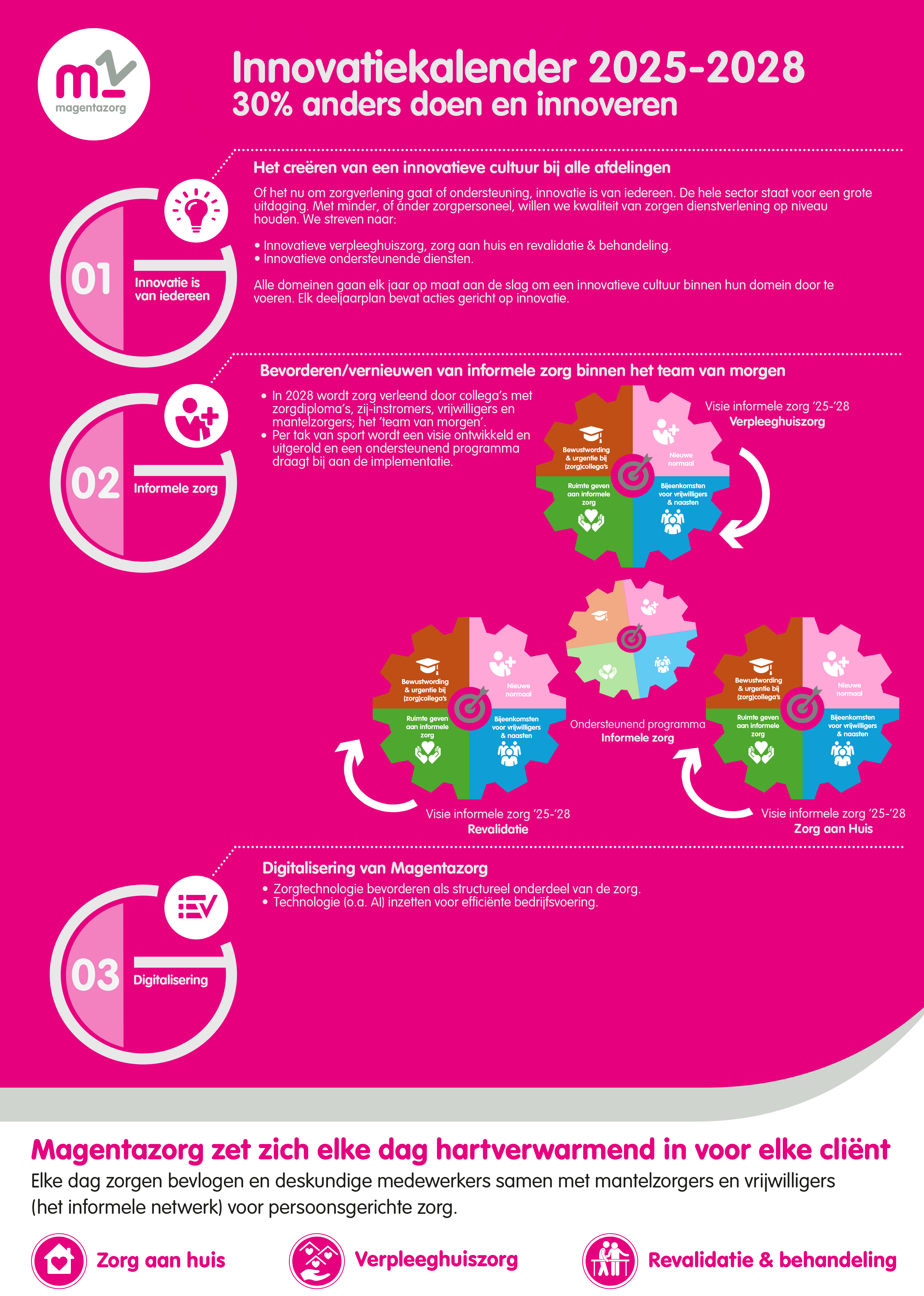 Het team van morgen (bestaande uit collega’s met zorgdiploma’s, zij-instromers, vrijwilligers en mantelzorgers) zorgt samen voor de juiste verzorging, behandeling en ondersteuning van ouderen en hun naasten. Elke dag weer. Daarnaast zijn we ook bezig om dingen ánders te doen en te innoveren. Hieronder de innovatiekalender 2025 – 2028.